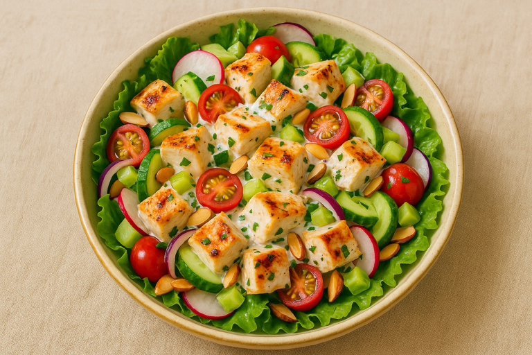 Ingredienti principali: petto di pollo, yogurt bianco magro, lattuga e ravenelli.
