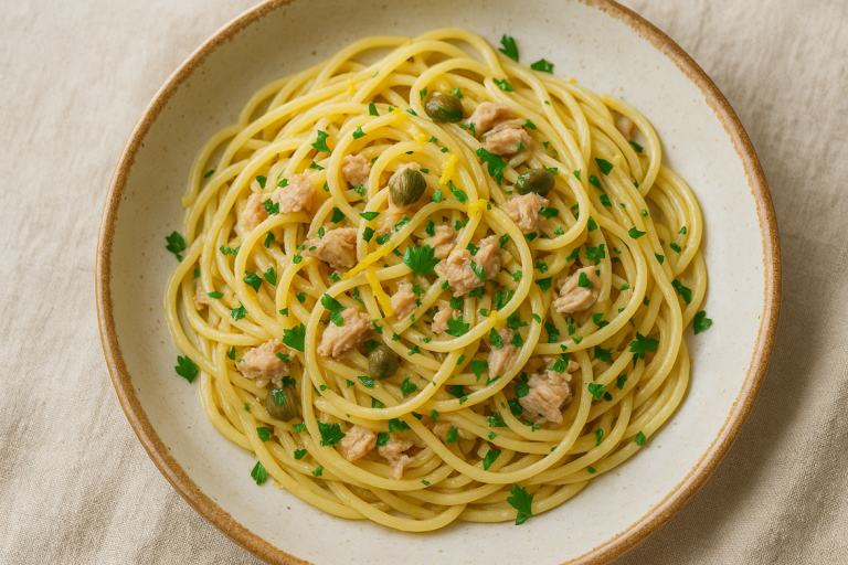 Cuoci la pasta, scola e unisci il tonno, un filo d’olio e il limone. Completa con prezzemolo tritato. Un piatto fresco, nutriente e pronto in 10 minuti.